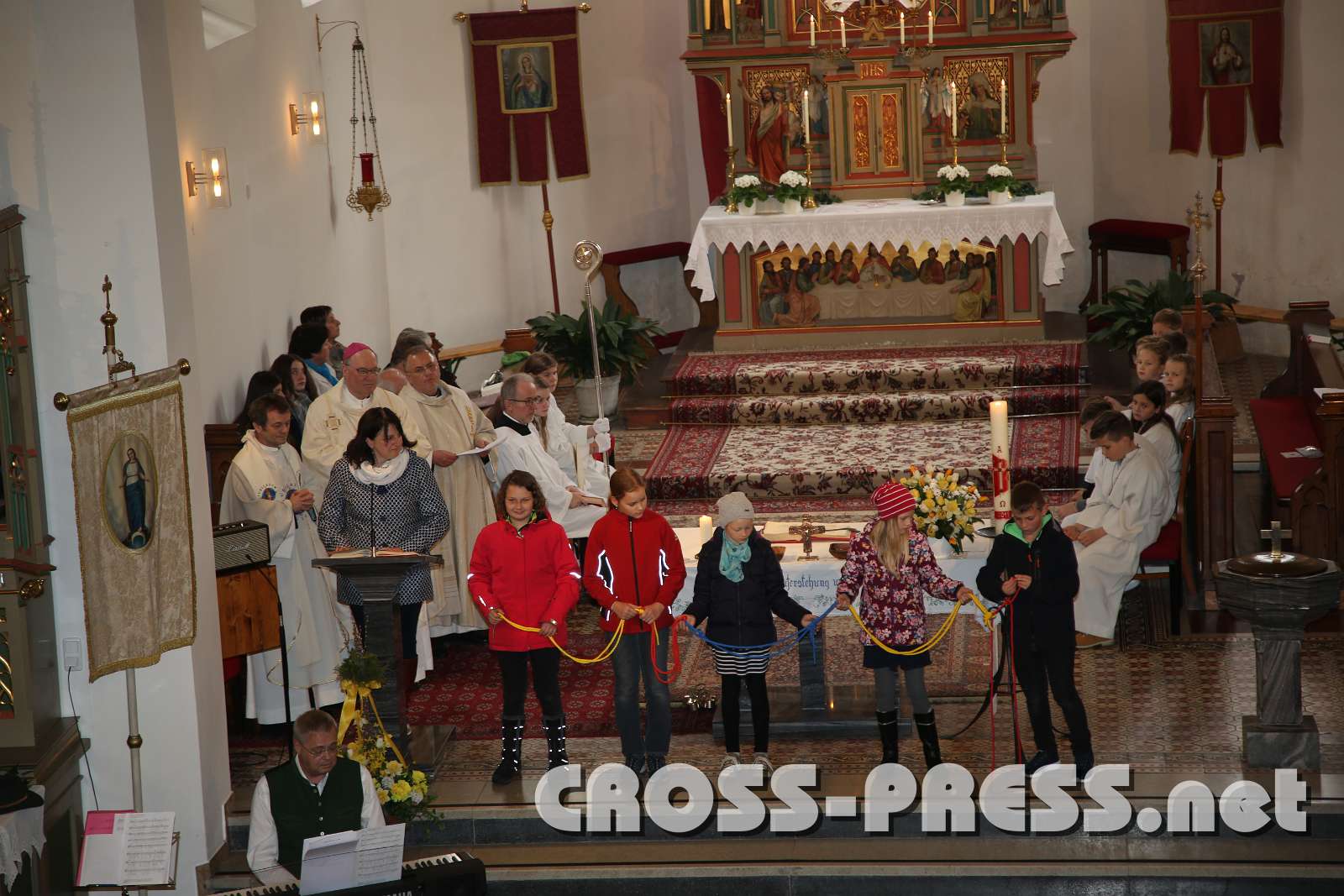Während der Fürbitten knüpften die Schüler ein buntes Band des Friedens untereinander, und so verbunden wurde das Vaterunser gebetet.