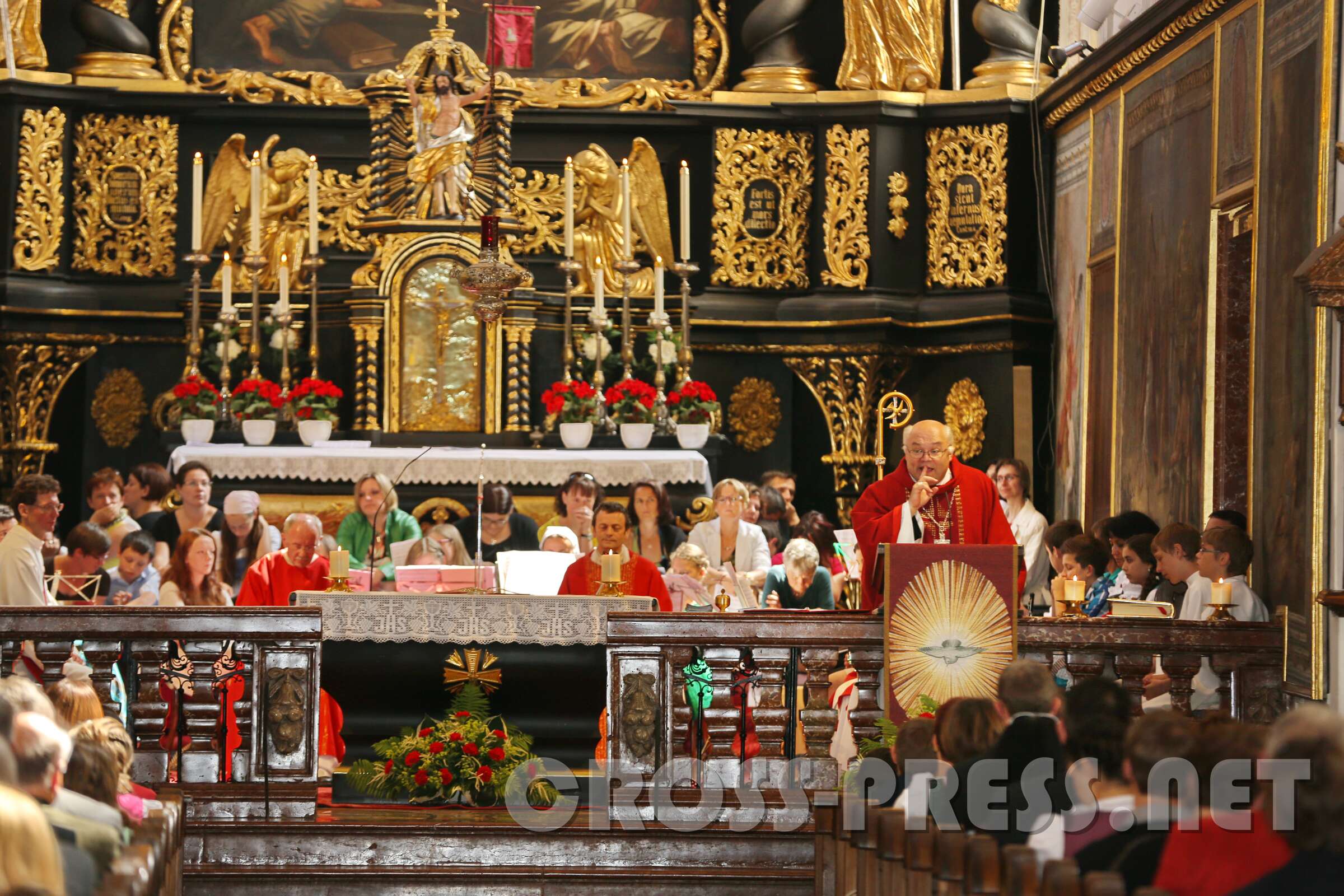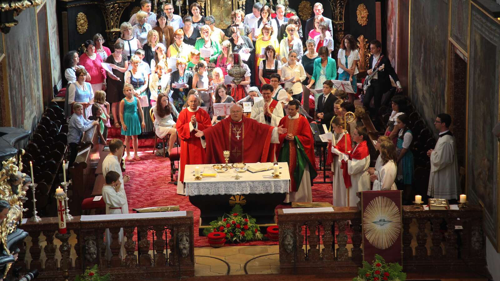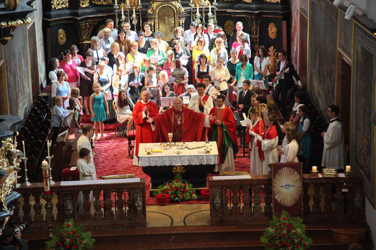 Die 30 Firmlinge in der ersten und 39 in der zweiten Messe erfuhren von ihrem firmspender Abt Petrus Pilsinger, dass es beim Fußballspielen neben dem Beachten der Regeln vor allem auf den Geist ankomme, der dahinter stehe. Denn viele würden gut spielen, aber nur wenige stechen hervor, wie etwa David Alaba. Ihm sei es wichtig, ein religiöses, also mit Gott verbundenes Leben zu führen. Er trägt unter seinem Trikot ein Leiberl, auf dem steht: "Meine Kraft liegt in Jesus!", und meinte in einem Interview: "Ein Leben ohne Gott ist wie Fußball ohne Ball." Es komme darauf an, den "Geist der Gebote" zu leben (vgl. Evangelium, Joh.14,15: "Wenn ihr mich liebt, werdet ihr meine Gebote halten!"). Diese seien nicht dazu da, um unser Gewissen zu beruhigen ("… hab eh niemanden umgebracht, nichts gestohlen, und lügen tu ich nur, wenn's ungedingt sein muss !"). Man fragt sich oft, wie Menschen mit einem schweren Schicksal trotzdem eine Ermutigung für uns sein können - wie sie das wohl schaffen. Es ist der Heilige Geist, der sie ermutigt und stärkt. Er lässt auch uns wissen, dass wir nicht allein sind. Jesus hat ihn auch uns geschickt, jedem, der gefirmt ist. Wir müssen aber auch offen sein für Ihn.
