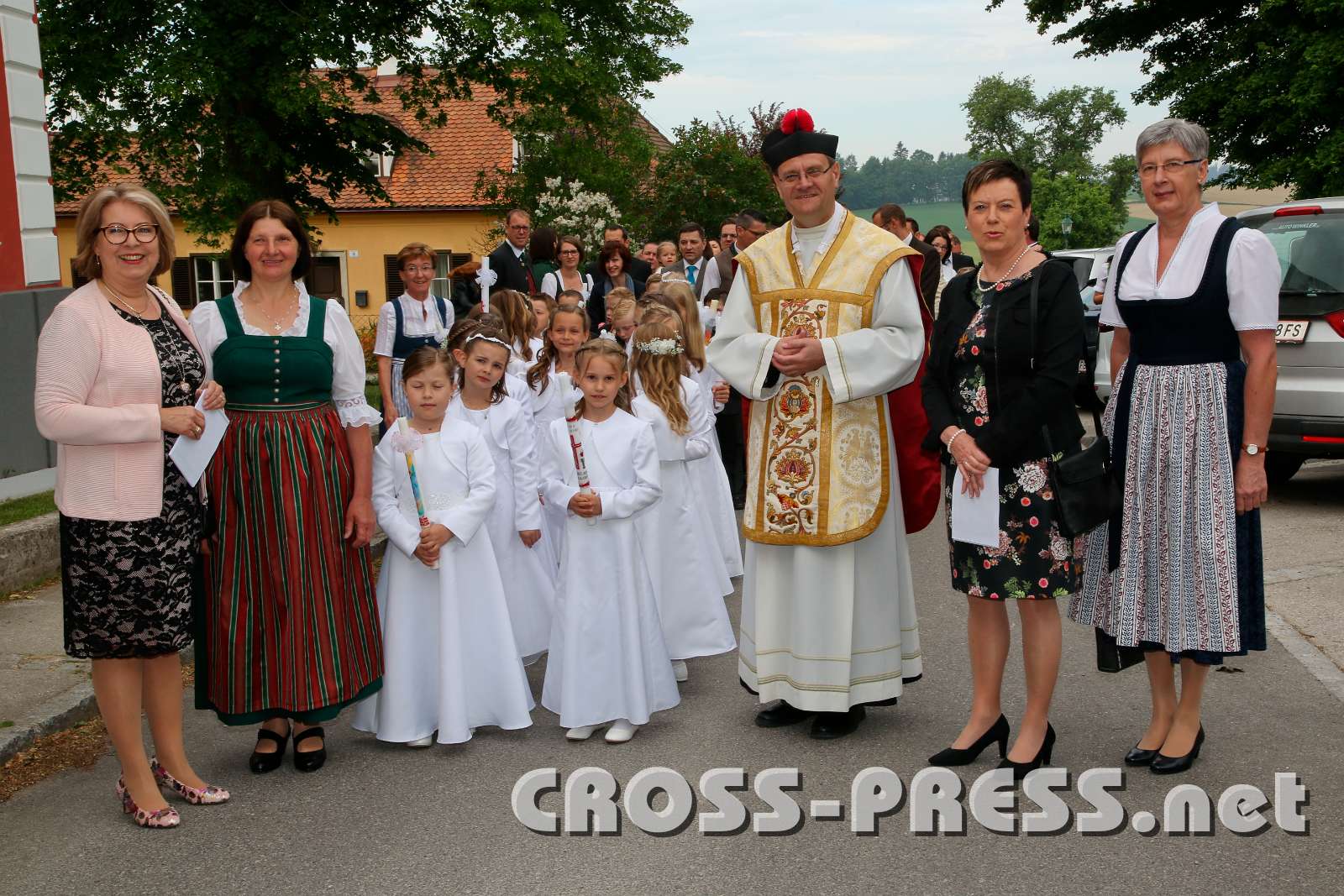Erstkommunion 2018 in Wolfsbach Die Frau Direktor, die Religionslehrerin und die beiden Klassenlehrerinnen mit Pfarrer P.Jacobus und den Erstkommunionkindern: startbereit zum Einzug ...