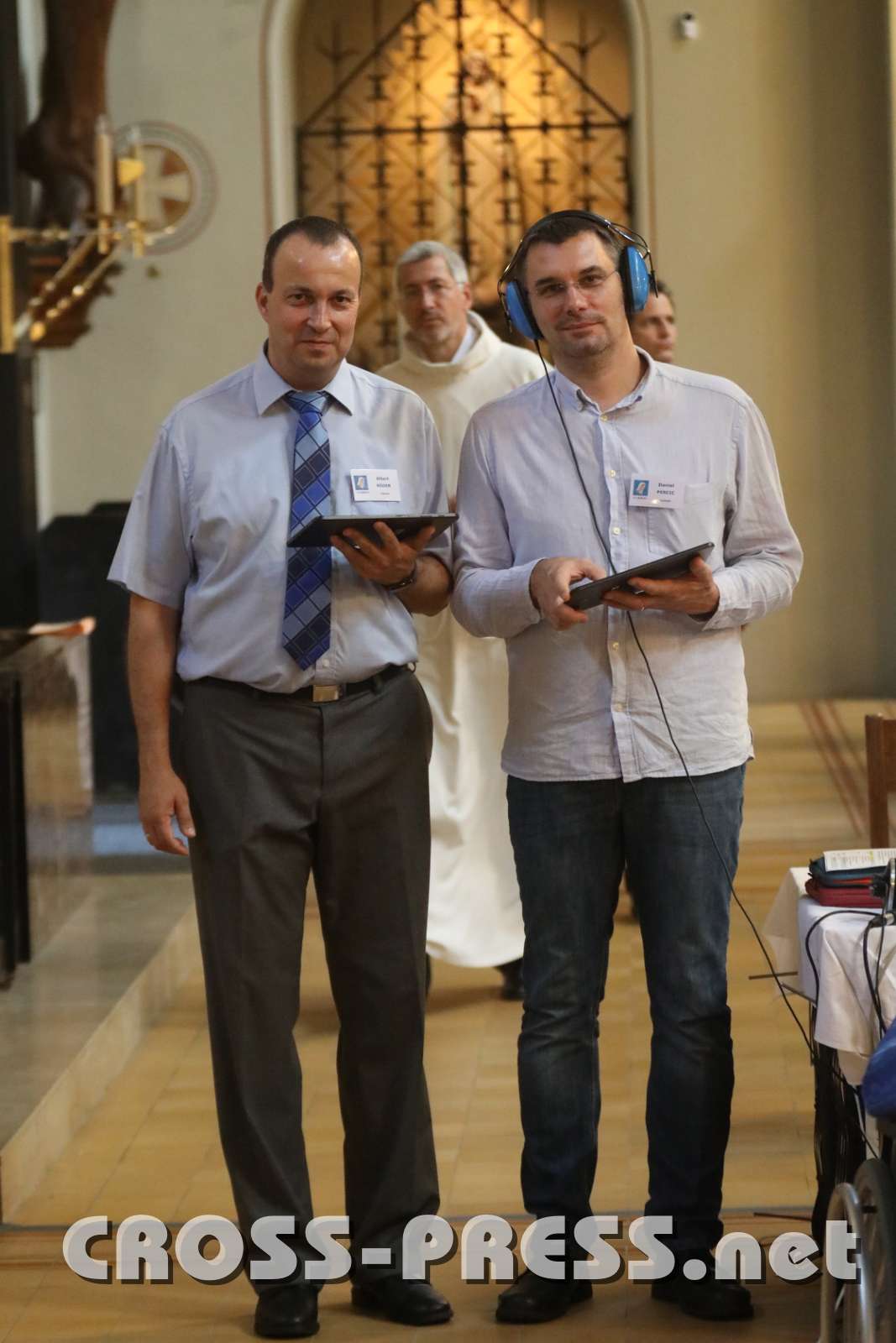 RM-JubiläumsFest mit Kardinal Schönborn Die beiden Techniker Albert Röder und Daniel Percic mit ihren praktischen Tablets. Dahinter der Programmdirektor.