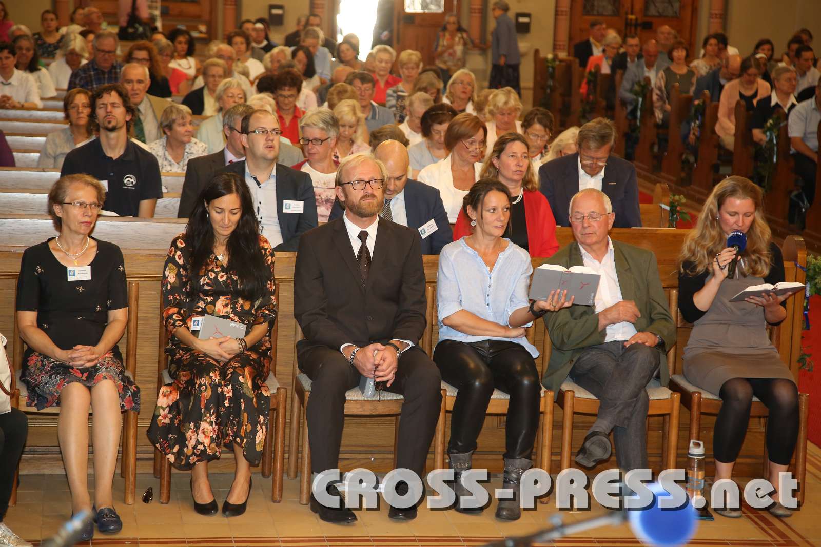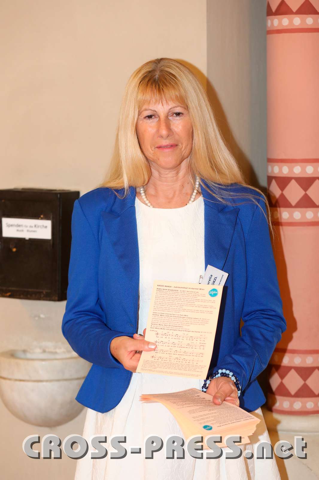 RM-JubiläumsFest mit Kardinal Schönborn Aurelia Stürzl, Leiterin des Hörerservices. verteilt Liederzetteln.