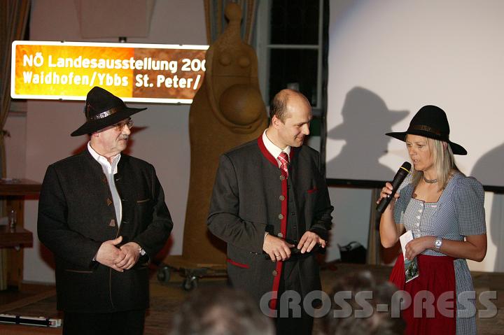 | FOTOGRAF: Cross-Press.net | KAMERA: Canon EOS-1DS | DATUM: 27.03.07 19:56 | AUFLÖSUNG: 3137 x 2091 | ISO-EINSTELLUNG: 800 | BELICHTUNGSMODUS: Auto exposure | Exp. bias: 0 EV | BELICHTUNGSDAUER: 1/200s | ÖFFNUNG: 2.8 | BRENNWEITE: 70.0mm | White Balance: Manual white balance | BLITZ: Flash fired | Headline: Auftaktveranstaltung zur Landesausstellung 'Feuer und Erde' | City: Seitenstetten | Copyright: Jerko Malinar | Caption: Hannes Pressl mit zwei SEPPn, Maximilian Hirsch und Anita Eybl. | Keywords: Landesausstellung |