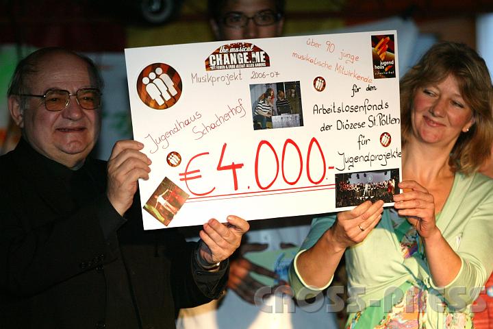 | KAMERA: Canon EOS-1DS | DATUM: 23.06.07 20:29 | AUFLÖSUNG: 2514 x 1676 | ISO-EINSTELLUNG: 500 | BELICHTUNGSMODUS: Auto exposure | BELICHTUNGSDAUER: 1/250s | ÖFFNUNG: 2.8 | BRENNWEITE: 165.0mm | BLITZ: Flash fired | Headline: atTENtion - 10 Jahre JugendHaus Schacherhof | City: Seitenstetten | Copyright: Jerko Malinar | Caption: Monsignore Wilfried Kreuth, Direktor des Pastoralamtes der Diözese, und Gerda Koller vom Arbeitslosenfond der Diözese übernahmen den Erlös von "change.me", eines vom Schacherhof Team selbst geschriebenen und produzierten Musicals. | Keywords: Jugend |