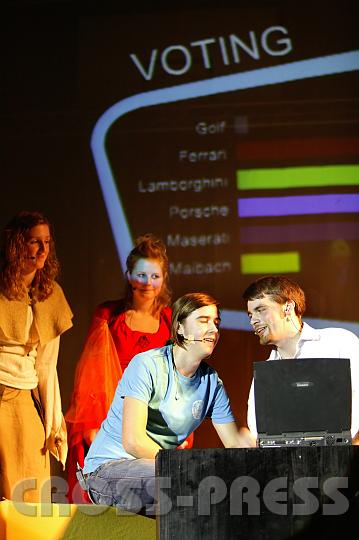 | Die Geschäftsidee entwickelt sich prächtig. Die Webseitenbesucher haben für Alex (Mitte) gerade ein Luxus-Sportauto gewählt ... und es ihm mittels Beiträgen für´s Voting auch finanziert. Sein Freund Phil (Lukas Michlmayr) hat ihm die Website programmiert. Die Website von Change.me programmierte Stefan Illich-Edlinger. | 07.03.03 064 |