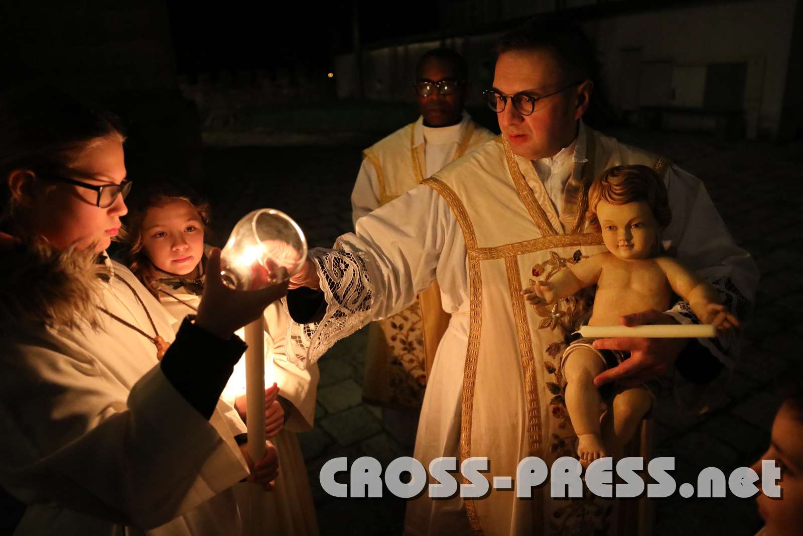 Pfarrer Vidović mit dem "Christkind" entzündet Prozessionskerze, vor dem Einzug zur Mette.